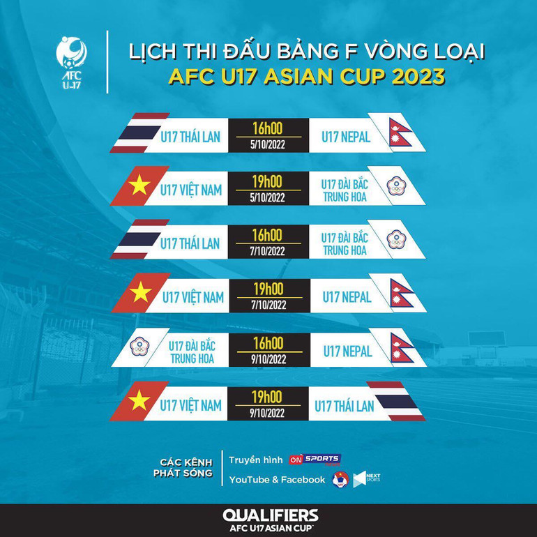 Các trận đấu của bảng F được đăng cai ở sân vận động Việt Trì (Phú Thọ). U17 Việt Nam sẽ đá trận ra quân gặp U17 Đài Loan (Trung Quốc) vào 19 giờ tối 5/10. Trước đó, U17 Thái Lan đấu U17 Nepal lúc 16 giờ.