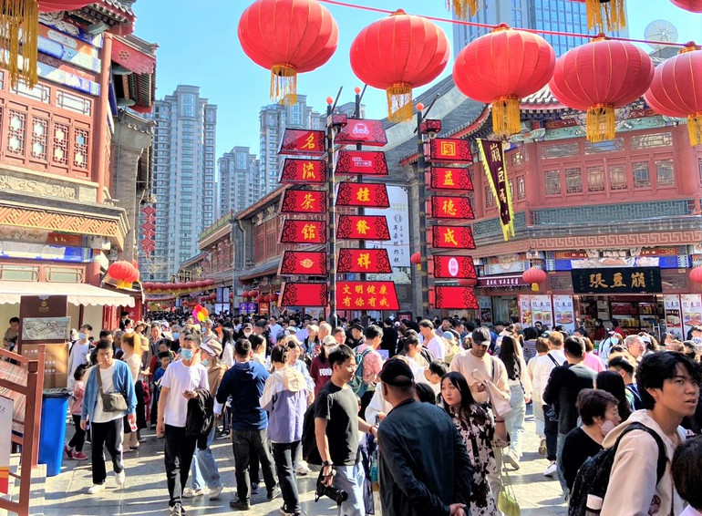 | Cảnh tượng đông đúc trước khu phố cổ thành phố Thiên Tân. (Ảnh: PHƯƠNG THẢO) |