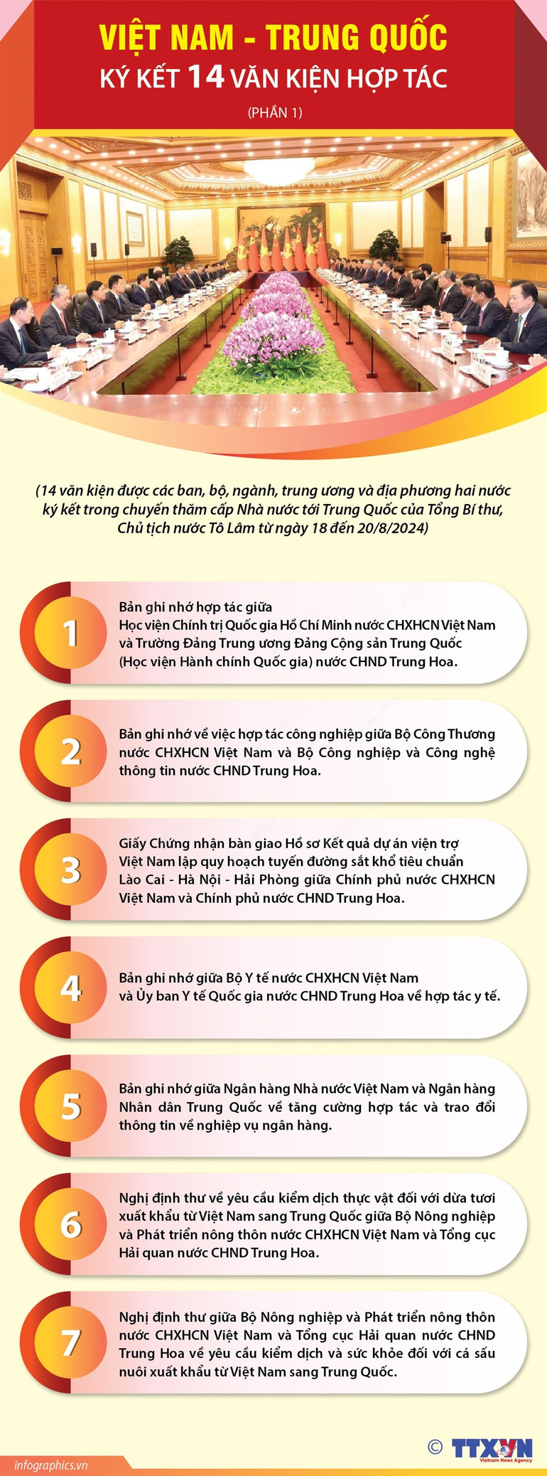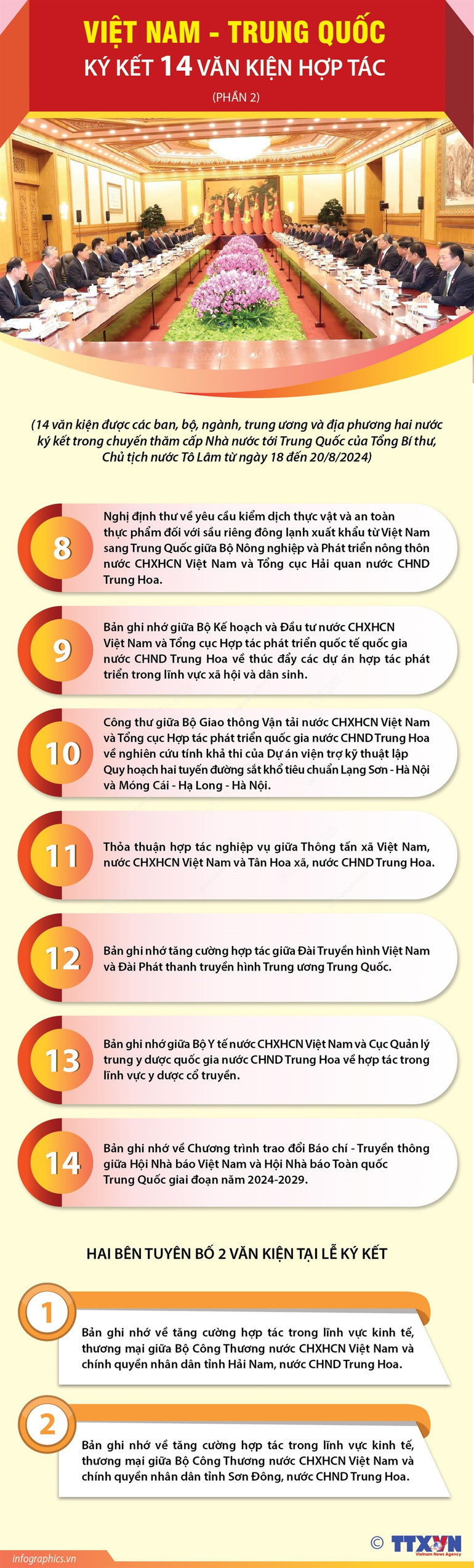 Ngày 19/8/2024, tại Đại lễ đường Nhân dân, thủ đô Bắc Kinh (Trung Quốc), ngay sau khi kết thúc hội đàm, Tổng Bí thư, Chủ tịch nước Tô Lâm và Tổng Bí thư, Chủ tịch Trung Quốc Tập Cận Bình đã cùng chứng kiến lễ ký 14 văn kiện được các ban, bộ, ngành, Trung ương và địa phương hai nước ký kết trong chuyến thăm cấp Nhà nước lần này.