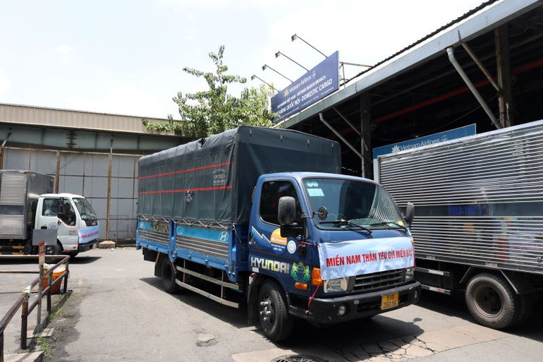 Lô hàng cứu trợ này được vận chuyển trên chuyến bay VN250 khởi hành lúc 15 giờ từ Thành phố Hồ Chí Minh đến Hà Nội để chuyển tiếp đến các vùng bị ảnh hưởng của bão lũ trong chiều nay.