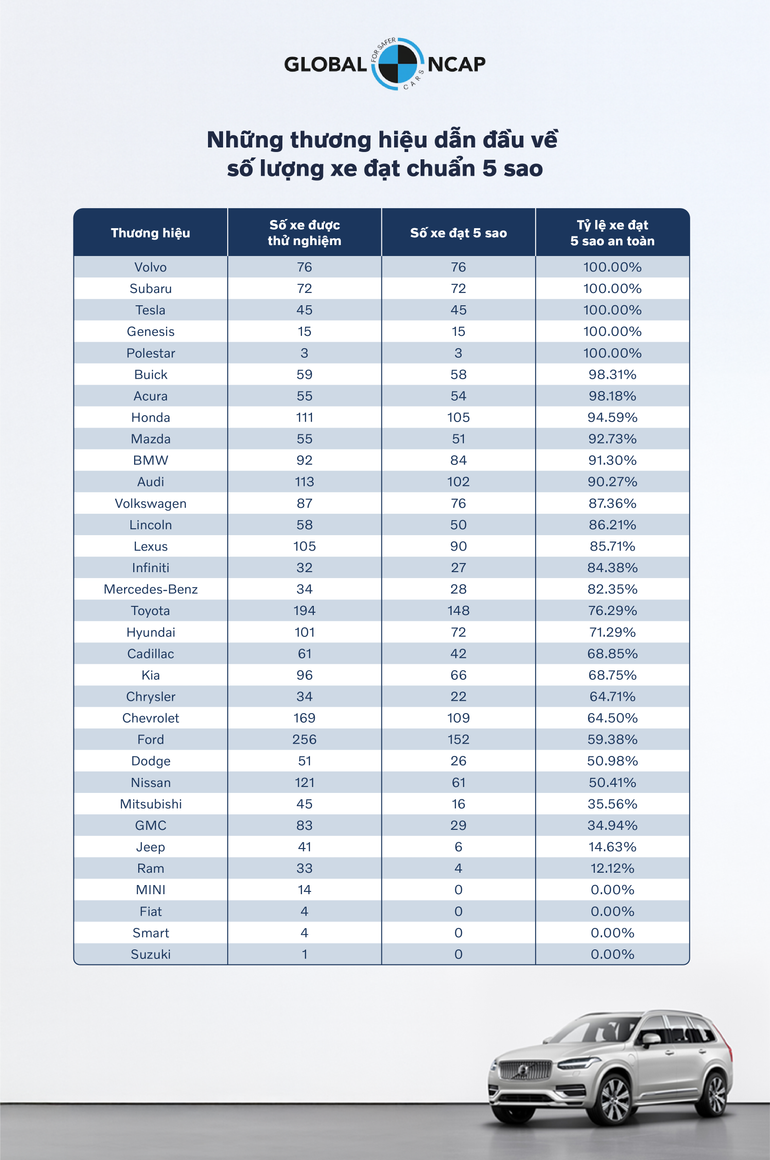 Trên thực tế, các bài thử nghiệm sẽ được tiến hành trên các giả lập tình huống va chạm khác nhau, thử thách một cách toàn diện các tính năng an toàn kể cả khả năng dự báo các tình huống đáng tiếc hoặc khi tài xế xao nhãng trong lúc cầm lái. Hơn nữa, số lượng mẫu xe được thử nghiệm cũng đóng vai trò quan trọng cho sự chính xác của kết quả cuối cùng. Trên thang điểm 5 sao về mức độ an toàn, có 5 thương hiệu cùng đạt điểm số tuyệt đối 100% trong mọi mẫu xe ra mắt trong 10 năm qua tại Mỹ, kể tới Volvo, Subaru, Tesla, Genesis và Polestar. Trong đó, Volvo dẫn đầu với 76/76 mẫu xếp hạng an toàn 5 sao NCAP.