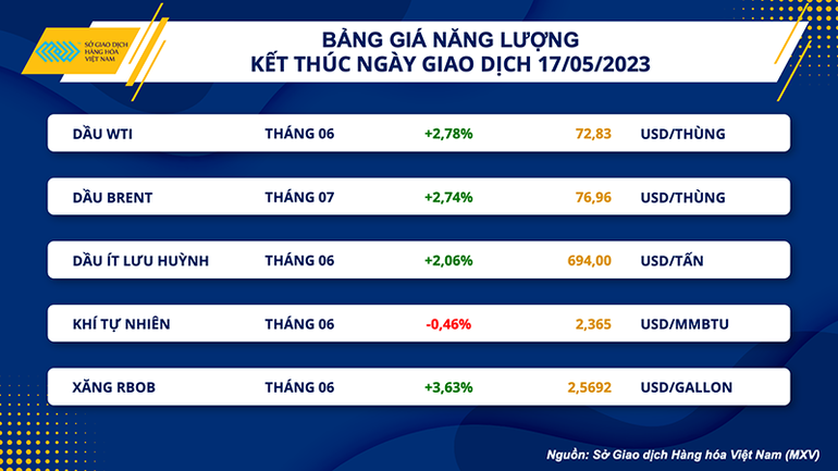 Giá dầu thô WTI tăng 2,78% lên 72,83 USD/thùng, và giá dầu thô Brent tăng 2,74% lên 76,96 USD/thùng. Tâm lý nhà đầu tư tích cực hơn bất chấp đà tăng của đồng USD và các số liệu từ báo cáo tuần của Cơ quan Quản lý Thông tin Năng lượng Mỹ (EIA). Chỉ số Dollar Index tăng lên 102,88 điểm, mức cao nhất trong vòng 1,5 tháng.
