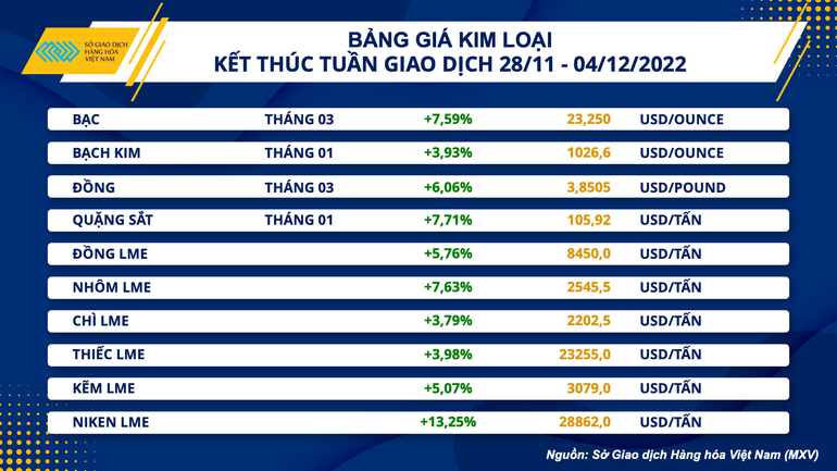 Nhóm kim loại quý, thường được coi là loại tài sản trú ẩn vì khả năng giữ giá, cũng có mức tăng rất ấn tượng. Giá bạch kim tăng 3,93% lên 1026,6 USD/ounce. Trong khi đó, giá bạc tăng rất mạnh, với mức đóng cửa tuần đạt 23,25 USD/ounce, cao hơn 7,59% so với tuần trước đó.