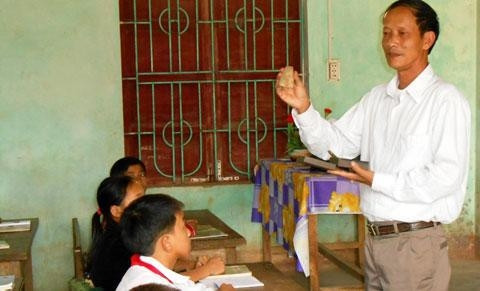 Thầy Lê Quốc Tường giới thiệu những chiếc rìu đá trong giờ lịch sử với các em học sinh lớp 6 Trường THC