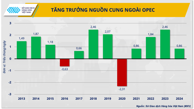 Thứ nhất, tăng trưởng sản lượng của các quốc gia ngoài OPEC+ sẽ giảm bớt trong năm 2024 giúp bỏ bớt áp lực đã đè nặng lên tổ chức trong năm 2023. Theo ước tính từ Công ty nghiên cứu thị trường WoodMac, tăng trưởng nguồn cung ngoài OPEC sẽ chậm lại trong 2024, chỉ còn 0,8 triệu thùng/ngày.