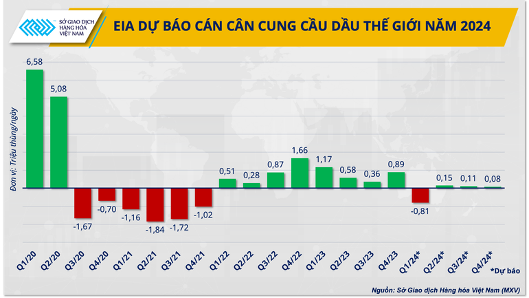 Theo báo cáo tháng 2 của Cơ quan Quản lý Thông tin Năng lượng Mỹ (EIA), thị trường sẽ thâm hụt khoảng 810.000 thùng/ngày trong quý I/2024 và giá dầu sẽ WTI đạt đỉnh 80 USD/thùng vào tháng 3 trước tác động cắt giảm sản lượng của OPEC+. Mặc dù vậy, nguồn cung được cải thiện sẽ gây áp lực trở lại lên thị trường ngay trong quý tới.