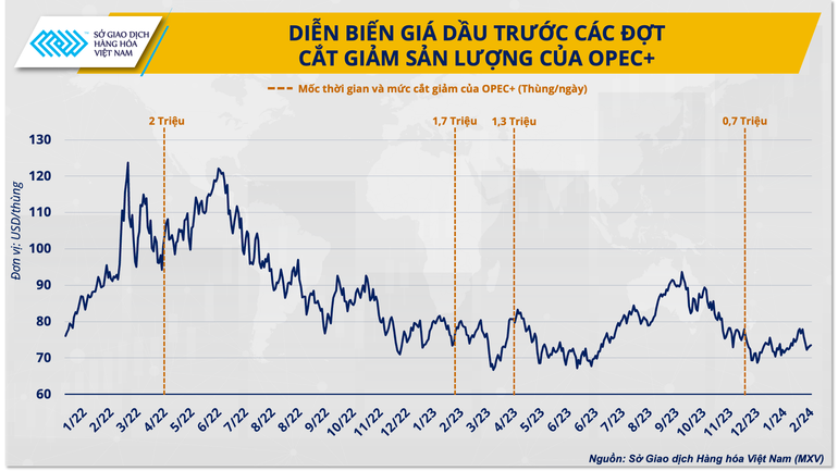 Kể từ khi thế giới mở cửa trở lại sau đại dịch Covid-19 đến nay, OPEC+ đã 4 lần cắt giảm sản lượng để hỗ trợ thị trường nhưng vẫn không ngăn được đà đi xuống của giá. Một tuần sau quyết định cắt giảm sản lượng 2,2 triệu thùng/ngày tại cuộc họp ngày 30/11/2023, giá dầu thế giới vẫn hạ sâu hơn 12%. Phản ứng tương tự trên thị trường cũng xảy ra sau phiên họp hồi tháng 3.