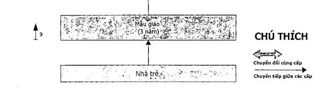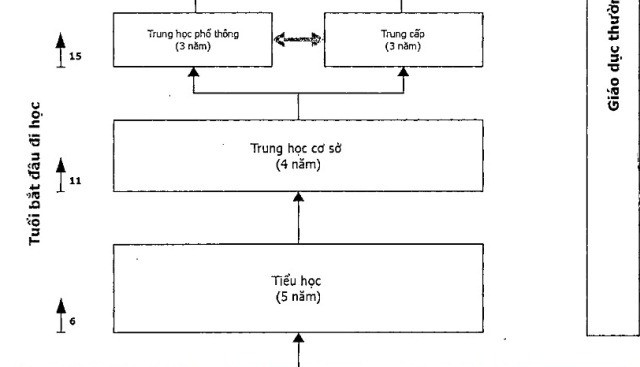 Tiêu chuẩn đầu vào, thời gian học tập và cơ hội học tập tiếp theo của các cấp học và trình độ đào tạo như sau:Giáo dục mầm non gồm giáo dục nhà trẻ và giáo dục mẫu giáo. Giáo dục nhà trẻ được thực hiện đối với trẻ từ 3 tháng tuổi đến 3 tuổi; giáo dục mẫu giáo được thực hiện đối với trẻ em từ 3 tuổi đến 6 tuổi.Giáo dục phổ thông gồm giáo dục tiểu học, giáo dục trung học cơ sở (giai đoạn giáo dục cơ bản) và giáo dục trung học phổ thông (giai đoạn giáo dục định hướng nghề nghiệp).