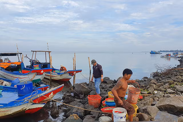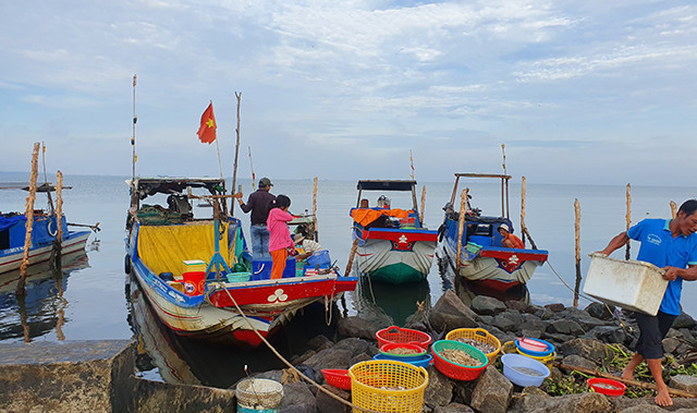 Sáng nay (29-4), Danh Chinh và những người bạn trong nhóm ngư dân ai cũng cười nói vui vẻ. Sáu chiếc thuyền đậu cặp nhau tại bến, Chinh và những người đàn ông sau khi giúp vợ đưa hết những khay, chậu lên “chợ”, các anh ngồi lựa lại mớ cá phân. Vừa làm việc, các anh vừa tán chuyện.