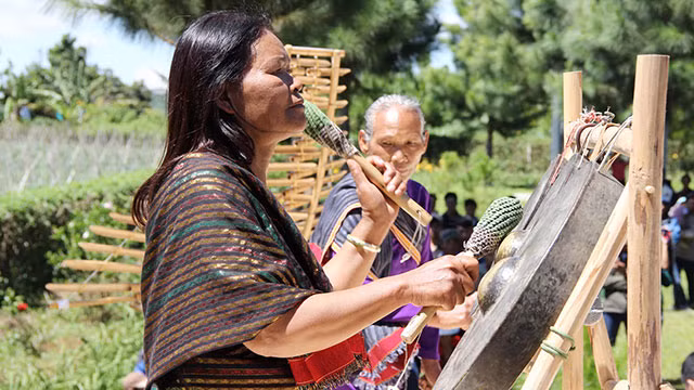 Nghệ nhân Ma Bio gõ nhịp chiêng Ba.