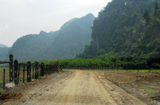 Tại đây, một con đường dài khoảng ba km, rộng chừng năm mét được làm mới dựa trên đường mòn cũ, chạy vào thung lũng Tú Làn (ảnh dưới). Toàn bộ kinh phí làm đường gần 2 tỷ đồng do đoàn làm phim chi trả.