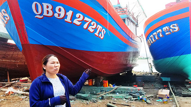 Theo Giám đốc Công ty TNHH dịch vụ tàu biển Bảo Ninh Hoàng Thị Sửu, bình quân mỗi năm, công ty đóng mới và cải hoán, sửa chữa cho 300 lượt tàu thuyền các loại. Công ty cũng đã thi công nhiều tàu cá công suất 1.000 CV, trong đó có nhiều tàu đóng mới theo Nghị định 67. “Chiếc tàu vỏ gỗ đầu tiên đóng theo Nghị định 67 ở Quảng Bình hạ thủy năm 2015 là đóng tại xưởng tôi. Ngày đầu khi họp bàn giữa đại diện chính quyền, ngân hàng và chủ tàu, thấy tôi là nữ, họ không tin tôi đóng được những chiếc tàu lớn như thế. Thấy họ còn nghi ngại, tôi nói cương quyết: “Nếu tôi không đóng được tàu, tôi đóng luôn xưởng”. Thấy tôi quyết tâm, lãnh đạo ngân hàng cùng các cán bộ kỹ thuật thủy sản, ngư dân đóng tàu xuống khảo sát xưởng, họ ngạc nhiên trước quy mô của công ty. Rứa là tôi có ngay hợp đồng đầu tiên. Đội thợ của tôi cũng quyết tâm không để tôi phải buồn, họ làm ngày, làm đêm cho kịp tiến độ. Ngày hạ thủy con tàu vỏ gỗ đầu tiên theo Nghị định 67, tôi được nhận thêm hai chiếc tàu khác, trị giá mỗi chiếc hơn 15 tỷ đồng”, chị Sửu chia sẻ đầy tự hào.