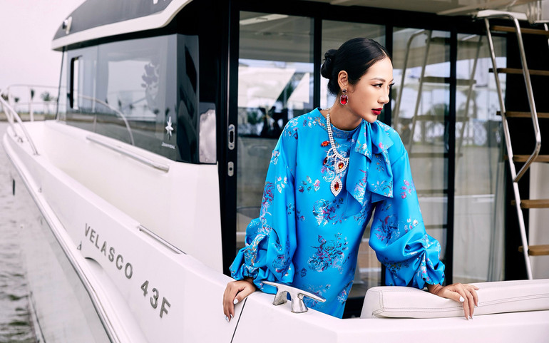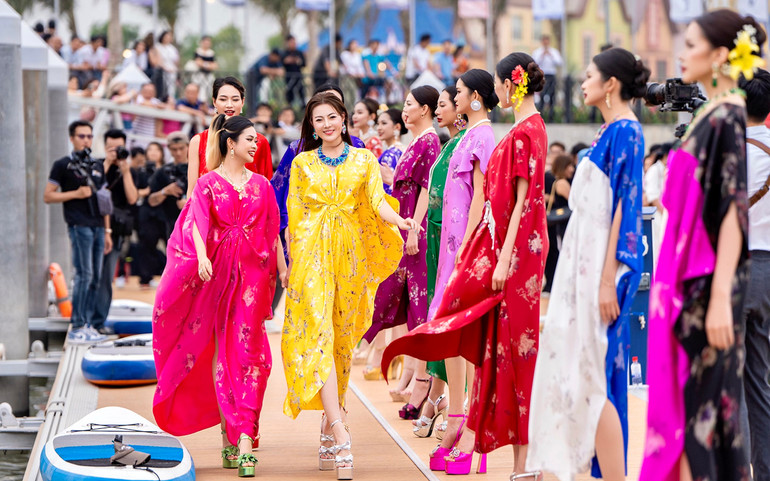 Bên cạnh đó, họa tiết hoa ánh bạc trên một số thiết kế được xử lý bằng kỹ thuật ánh xà cừ cao cấp, tạo hiệu ứng lấp lánh dưới ánh sáng – như một phép ẩn dụ cho ánh nhìn dịu dàng nhưng luôn nổi bật. Mỗi thiết kế là một bản sắc riêng về màu sắc, giống như từng đóa hoa lụa đang nở rộ giữa đại dương, tạo nên một “vũ khúc” giàu tầng cảm xúc.