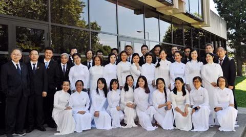 Các thành viên Hợp ca quê hương chụp ảnh kỷ niệm trước Học viện âm nhạc Rouen.