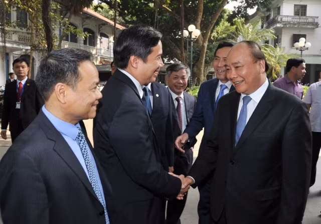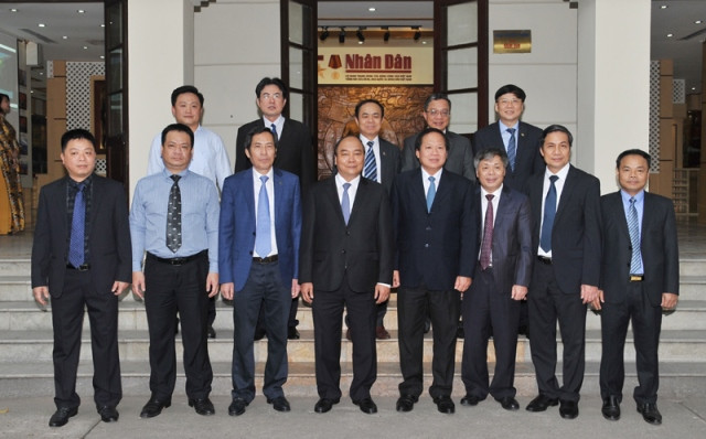 Các đồng chí lãnh đạo Báo Nhân Dân chào mừng chuyến thăm và làm việc của Thủ tướng Nguyễn Xuân Phúc.