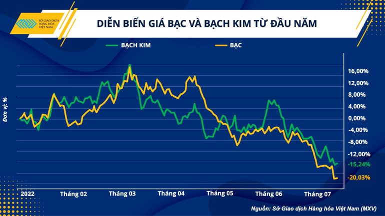 Theo Sở Giao dịch Hàng hoá Việt Nam (MXV), chỉ số MXV-Index kim loại đã đánh mất gần 400 điểm xuống còn 1.503,76 điểm kể từ đầu năm cho tới nay, tương đương với mức giảm 20%. Kể từ khi FED tăng lãi suất lần đầu tiên trong năm vào giữa tháng 3 sau 2 năm duy trì chính sách tiền tệ nới lỏng, giá bạc và bạch kim đã đánh mất lần lượt khoảng 28% và 25% giá trị. Hiện tại, giá bạc đang dao động quanh mức 18 USD/ounce, trong khi bạch kim suy yếu xuống khoảng 817 USD/ounce. Cả hai mặt hàng này đều đang ở vùng giá thấp nhất trong vòng 2 năm qua.