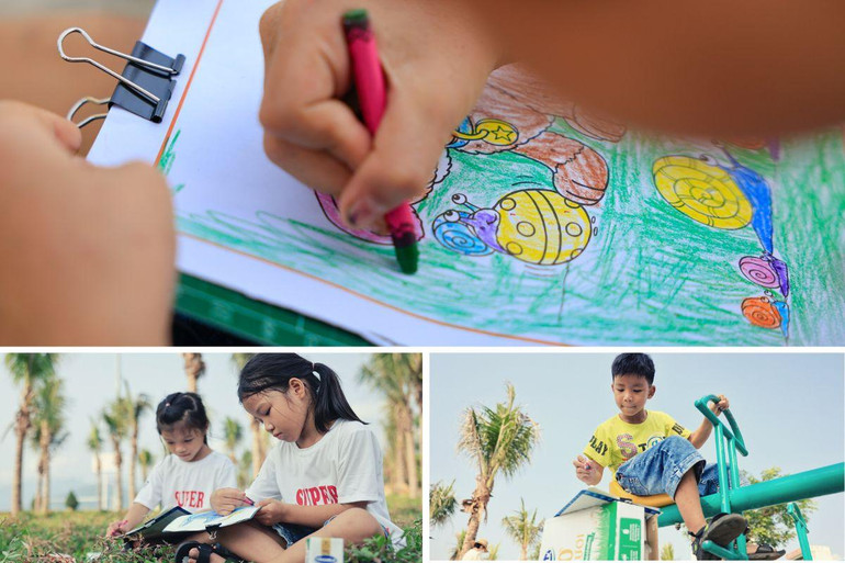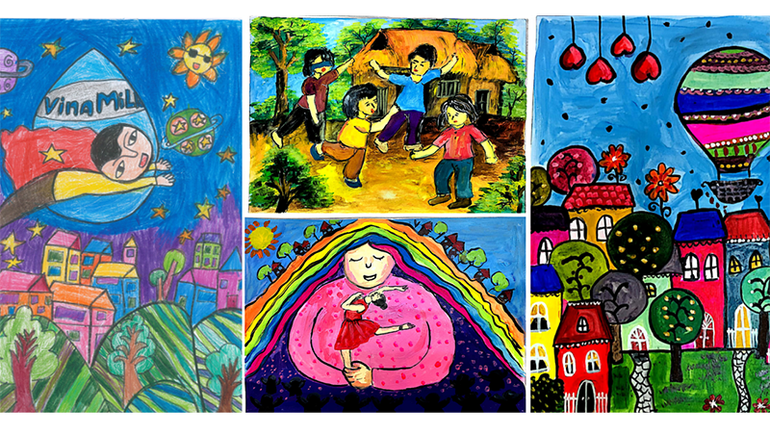 Thế là những trải nghiệm với biển, với những cô bò sữa hay niềm vui uống sữa được các em thể hiện ngay trong những bức tranh của mình. Với trí tưởng tượng phong phú, cuộc sống muôn màu và những ước mơ trẻ thơ đã được thể hiện qua những bức tranh đầy màu sắc.