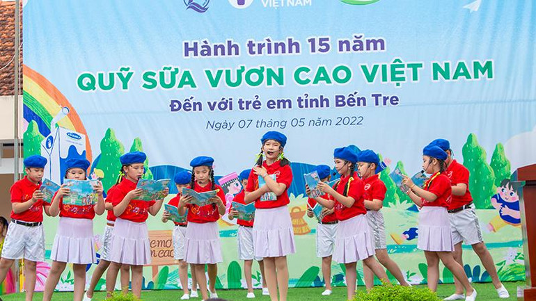 Trong ảnh là các em học sinh Trường Tiểu học Tân Thành Bình 1 (huyện Mỏ Cày Bắc, tỉnh Bến Tre) trong ngày hội đón nhận 106.000 ly sữa từ Quỹ sữa Vươn cao Việt Nam và Vinamilk vào tháng 5/2022. 15 năm qua, mỗi nơi Quỹ sữa dừng chân, nơi ấy đều có những nụ cười trẻ thơ.