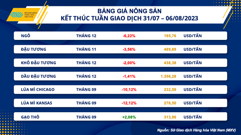 Theo thông tin từ Sở Giao dịch hàng hóa Việt Nam, trong tuần giao dịch 31/7-6/8, đà giảm chủ yếu xuất phát từ thị trường nông sản, với 6/7 mặt hàng đồng loạt đóng cửa tuần trong sắc đỏ. Giá lúa mì hợp đồng tháng 9 đóng cửa với mức giảm lên tới 10,12%,  giá ngô khép lại tuần vừa rồi với mức giảm 6,22%.