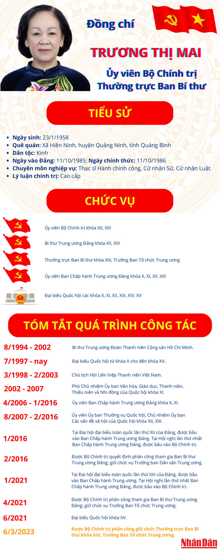Ngày 6/3, Bộ Chính trị đã phân công đồng chí Trương Thị Mai, Ủy viên Bộ Chính trị, Bí thư Trung ương Đảng, Trưởng Ban Tổ chức Trung ương giữ chức Thường trực Ban Bí thư khóa XIII, Trưởng Ban Tổ chức Trung ương.