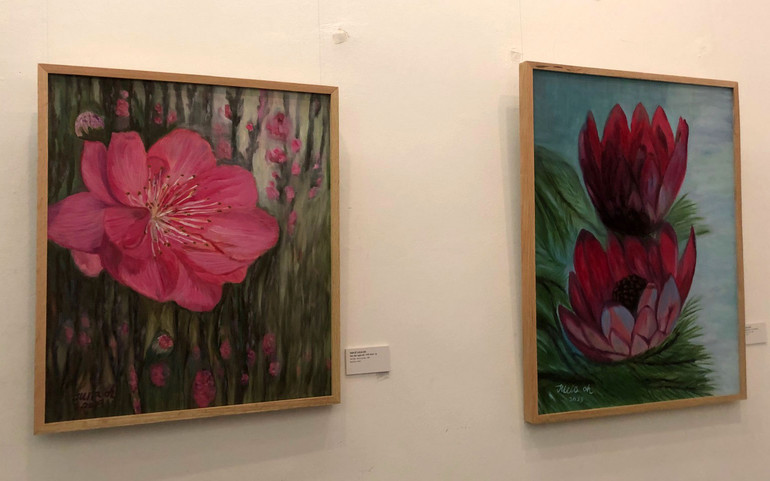 Cũng đậm chất nữ tính, họa sĩ Julia Oh mang đến triển lãm những thế giới rực rỡ trong các tác phẩm tranh sơn dầu của mình. Đó là những cánh đồng tràn sắc hoa, những thác nước bọt trắng tung trời ở những bức tranh khổ lớn, sắc hoa đào rực rỡ ngày Tết, những ánh sáng lộng lẫy từ cây nến, từ ánh mặt trời, từ ánh lửa…