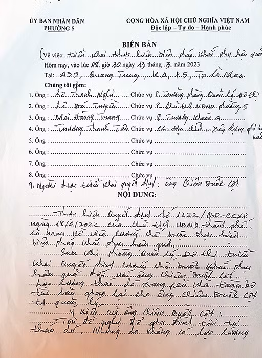 | Biên bản ghi nhận việc cưỡng chế nhà vi phạm đối với ông Cột vào sáng 13/3/2023 có ý kiến đề nghị gia đình ông tự tháo dỡ. |