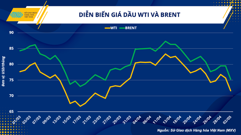 Theo Sở Giao dịch Hàng hóa Việt Nam (MXV), kết thúc phiên giao dịch ngày 2/5, giá dầu ghi nhận biến động rất mạnh với mức giảm hơn 5% đối với cả 2 mặt hàng dầu WTI và Brent, xuống lần lượt các mức 71,66 USD/thùng và 75,32 USD/thùng, mức thấp nhất trong vòng 5 tuần qua.