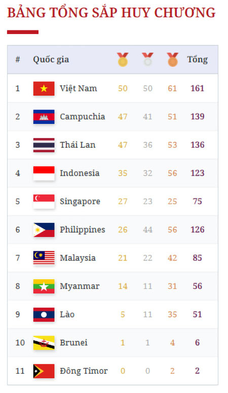 Hôm qua (10/5) tiếp tục là một ngày thi đấu thành công của Đoàn Thể thao Việt Nam khi đoạt thêm 11 Huy chương vàng (HCV), nâng tổng số HCV lên con số 50 và vươn lên xếp thứ nhất toàn đoàn, trong khi hai đoàn thể thao Campuchia và Thái Lan cùng đoạt 47 HCV và hơn kém nhau về số lượng Huy chương bạc (HCB) lần lượt xếp ở vị trí thứ hai và thứ ba.