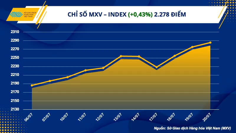 Số liệu từ Sở Giao dịch Hàng hóa Việt Nam (MXV) cho thấy, đóng cửa ngày hôm qua 20/7, lực mua tiếp tục chiếm ưu thế trên thị trường hàng hóa nguyên liệu, hỗ trợ chỉ số MXV-Index tăng phiên thứ 3 liên tiếp với mức tăng 0,43% lên 2.278 điểm. Giá trị giao dịch toàn Sở tăng gần 30% lên 4.100 điểm.