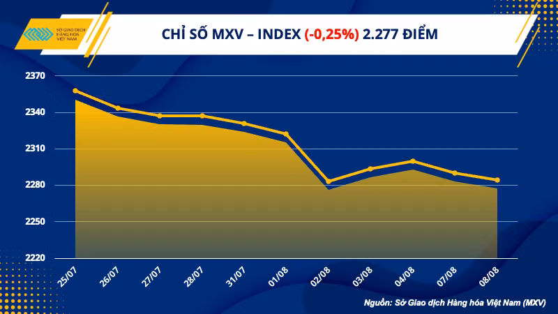 Số liệu từ Sở Giao dịch Hàng hóa Việt Nam (MXV) cho thấy, kết thúc ngày giao dịch hôm qua (8/8), thị trường hàng hóa diễn biến trái chiều với sắc xanh đỏ đan xen trên bảng giá. Tuy nhiên, lực bán chiếm ưu thế đã kéo chỉ số MXV-Index tiếp tục suy yếu 0,25% xuống 2.277 điểm. Giá trị giao dịch toàn Sở đạt trên 3.350 tỷ đồng.