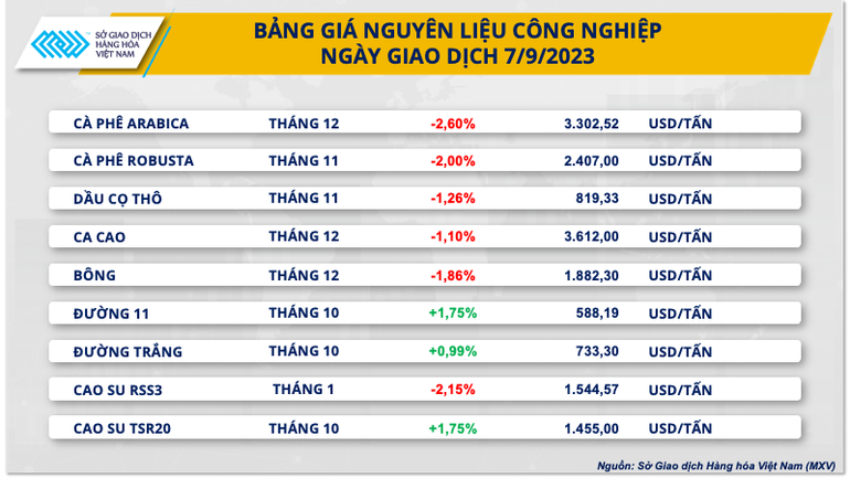 Đóng cửa ngày 7/9, sắc đỏ áp đảo trên bảng giá các mặt hàng nhóm nguyên liệu công nghiệp.