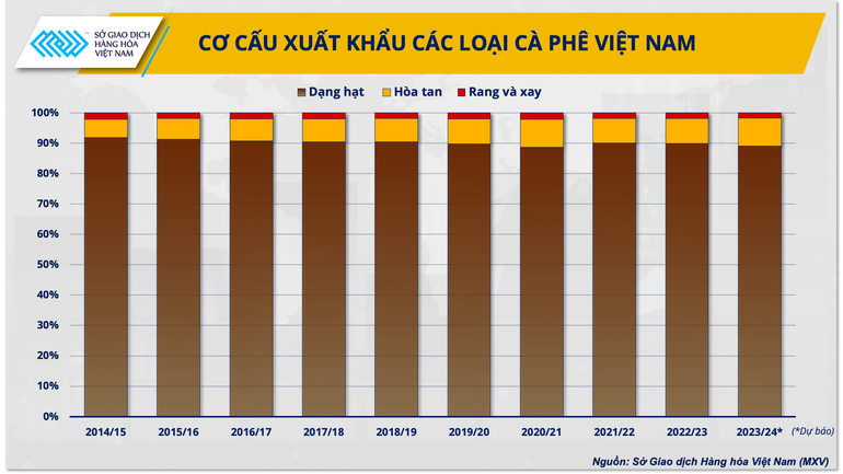 Do chưa nhanh nhạy với sự thay đổi "khẩu vị" của bạn hàng lớn Mỹ là giảm nhập Robusta, tăng tỷ trọng sản phẩm cà phê qua chế biến nên theo thống kê của USDA, 90% cà-phê Robusta xuất khẩu của Việt Nam niên vụ 2022/23 vẫn là cà-phê thô dạng hạt, gần như không đổi so với 5 năm trước.
