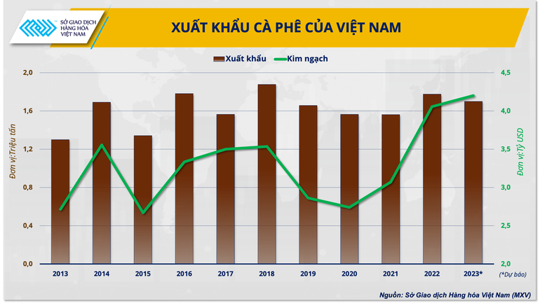 Theo Bộ Nông nghiệp và Phát triển nông thôn, năm 2023, Việt Nam có thể thu về 4,2 tỷ USD từ việc xuất khẩu 1,7 triệu tấn cà-phê. Như vậy, xuất khẩu cà-phê đang đứng trước cơ hội phá kỷ lục chưa từng có từ trước tới nay và đánh dấu năm thứ hai liên tiếp ngành cà-phê Việt Nam đạt trên 4 tỷ USD. Đây là cơ sở để các doanh nghiệp ngành có thể đặt kỳ vọng vào mục tiêu 6 tỷ USD của năm 2030.