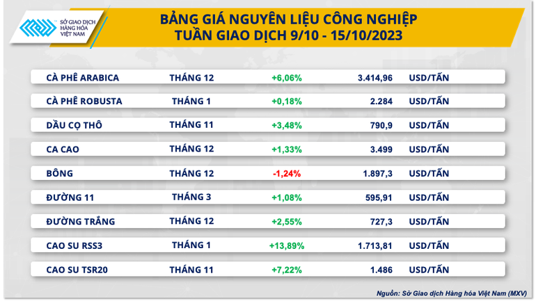 Kết thúc tuần giao dịch 9-15/10, bông là mặt hàng duy nhất trong nhóm nguyên liệu công nghiệp suy yếu với mức giảm 1,24% so với tham chiếu.
