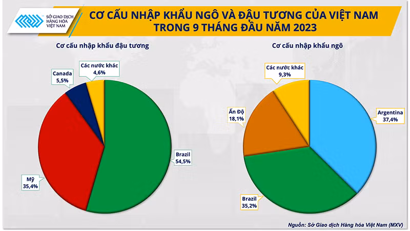 Theo dữ liệu sơ bộ từ Tổng cục Hải quan, trong 9 tháng đầu năm nay, Việt Nam đã nhập khẩu gần 2,3 triệu tấn đậu tương từ Brazil, chiếm 54,5% tổng khối lượng nhập khẩu của cả nước. Trong khi đó, đối với ngô, Argentina và Brazil đều đóng vai trò quan trọng khi chiếm đến 72,6% lượng hàng đến Việt Nam.