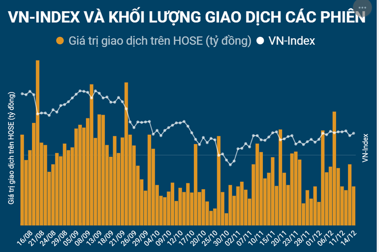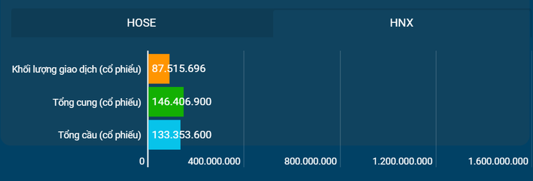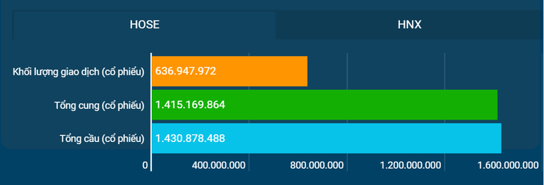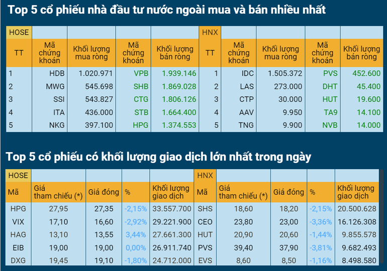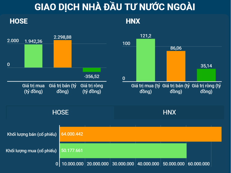 Thanh khoản trên hai sàn niêm yết đạt 16.385,47 tỷ đồng, giảm 20,88% so với phiên trước, dưới mức trung bình. Nhà đầu tư nước ngoài tiếp tục xu hướng bán ròng mạnh với giá trị bán ròng 356,52 tỷ đồng trên HOSE trong phiên hôm nay, tập trung ở các cổ phiếu ngân hàng, thép, bất động sản; duy trì mua ròng trên HNX với giá trị 35,14 tỷ đồng.