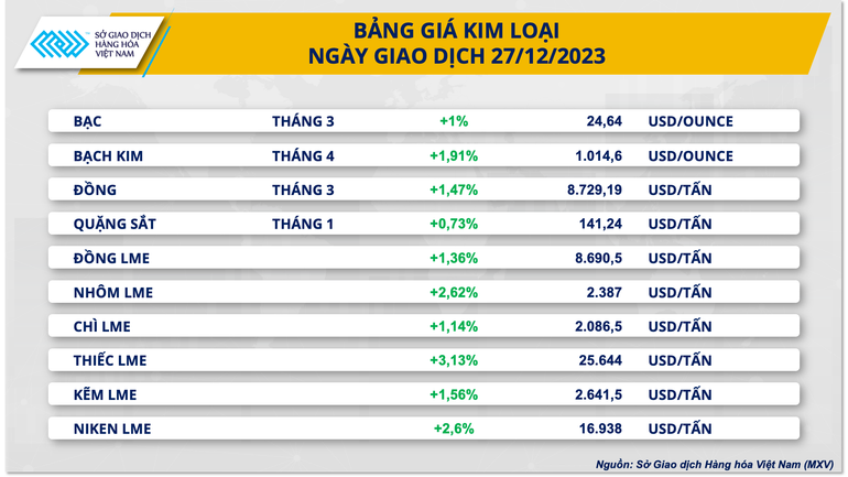 Theo MXV, kết thúc ngày giao dịch 27/12, sắc xanh phủ kín bảng giá kim loại. Đối với kim loại quý, giá bạch kim vượt mốc 1.000 USD/ounce lần đầu tiên sau 6 tháng. Chốt phiên, giá bạch kim bật tăng 1,91% lên 1.014,6 USD/ounce, mức cao nhất kể từ tháng 6/2023. Giá bạc cũng phục hồi 1%, đóng cửa tại mức 24,64 USD/ounce.