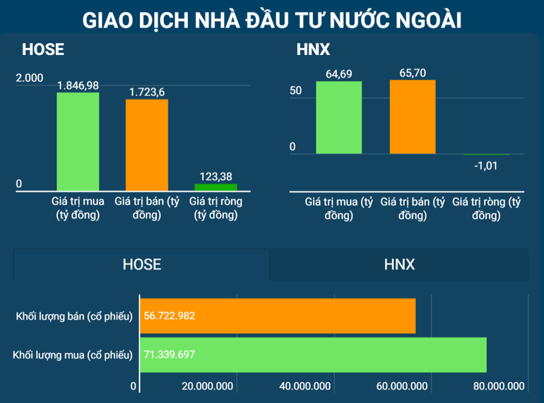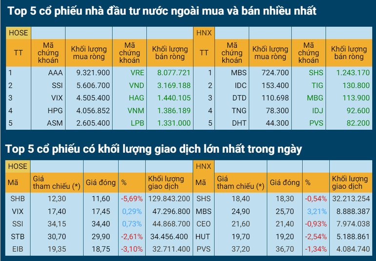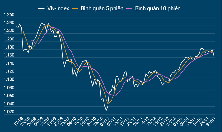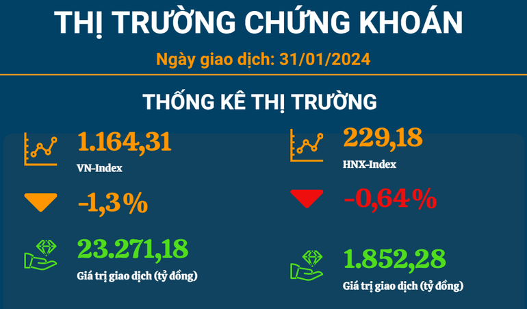 Kết phiên giao dịch ngày 31/1, VN-Index giảm 15,34 điểm (-1,30%) về mức 1.164,31 điểm. HNX-Index giảm 1,49 điểm (-0,651%) về mức 229,186 điểm. Thanh khoản trên hai sàn niêm yết tăng đột biến 69,12% lên 25.116,32 tỷ đồng, vượt mức trung bình. Khối ngoại gia tăng tỷ trọng giao dịch, mua ròng với giá trị 97,88 tỷ đồng; bán ròng trên HNX với giá trị 1,01 tỷ đồng.