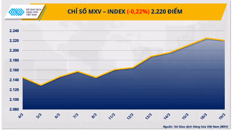 Số liệu từ Sở Giao dịch Hàng hóa Việt Nam (MXV) cho thấy, lực bán áp đảo trên thị trường hàng hóa nguyên liệu ngày hôm qua (19/3). Trong đó, nhiều mặt hàng nhóm nguyên liệu và kim loại đồng loạt giảm giá kéo chỉ số MXV-Index rơi nhẹ 0,22% xuống 2.220 điểm. Giá trị giao dịch đạt trên 5.200 tỷ đồng.