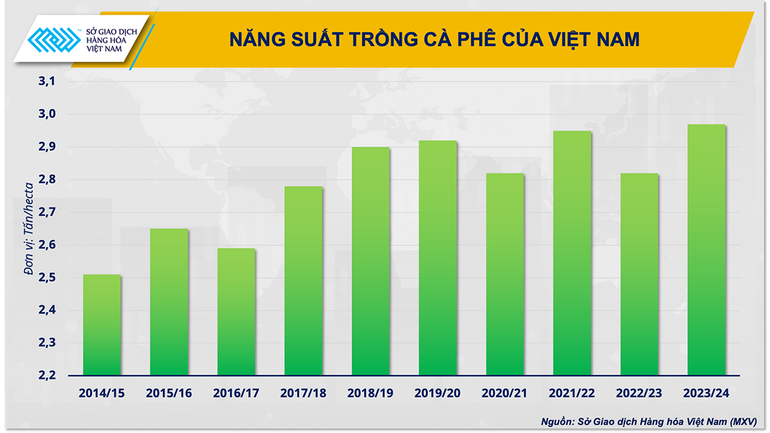 Hiện nay, Việt Nam vẫn được biết đến là quốc gia có năng suất cà-phê lớn nhất thế giới nhưng không có sự cải thiện đáng kể nào trong những năm gần đây. Kể từ niên vụ 2018-2019 đến nay, năng suất cà-phê nước ta vẫn chỉ dao động trong khoảng 2,9-3,0 tấn/ha.