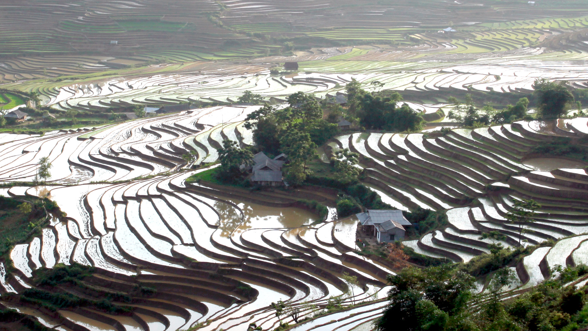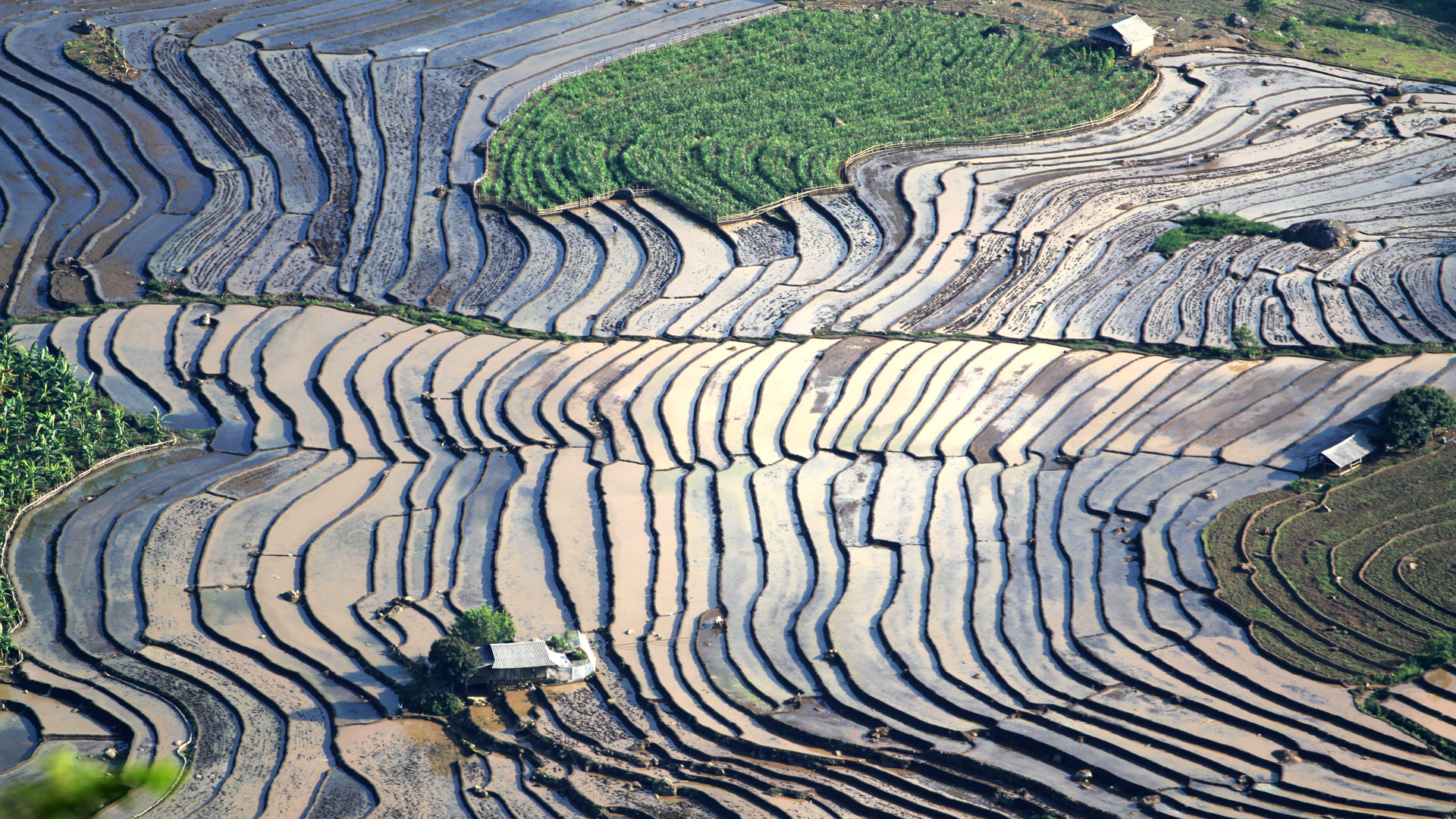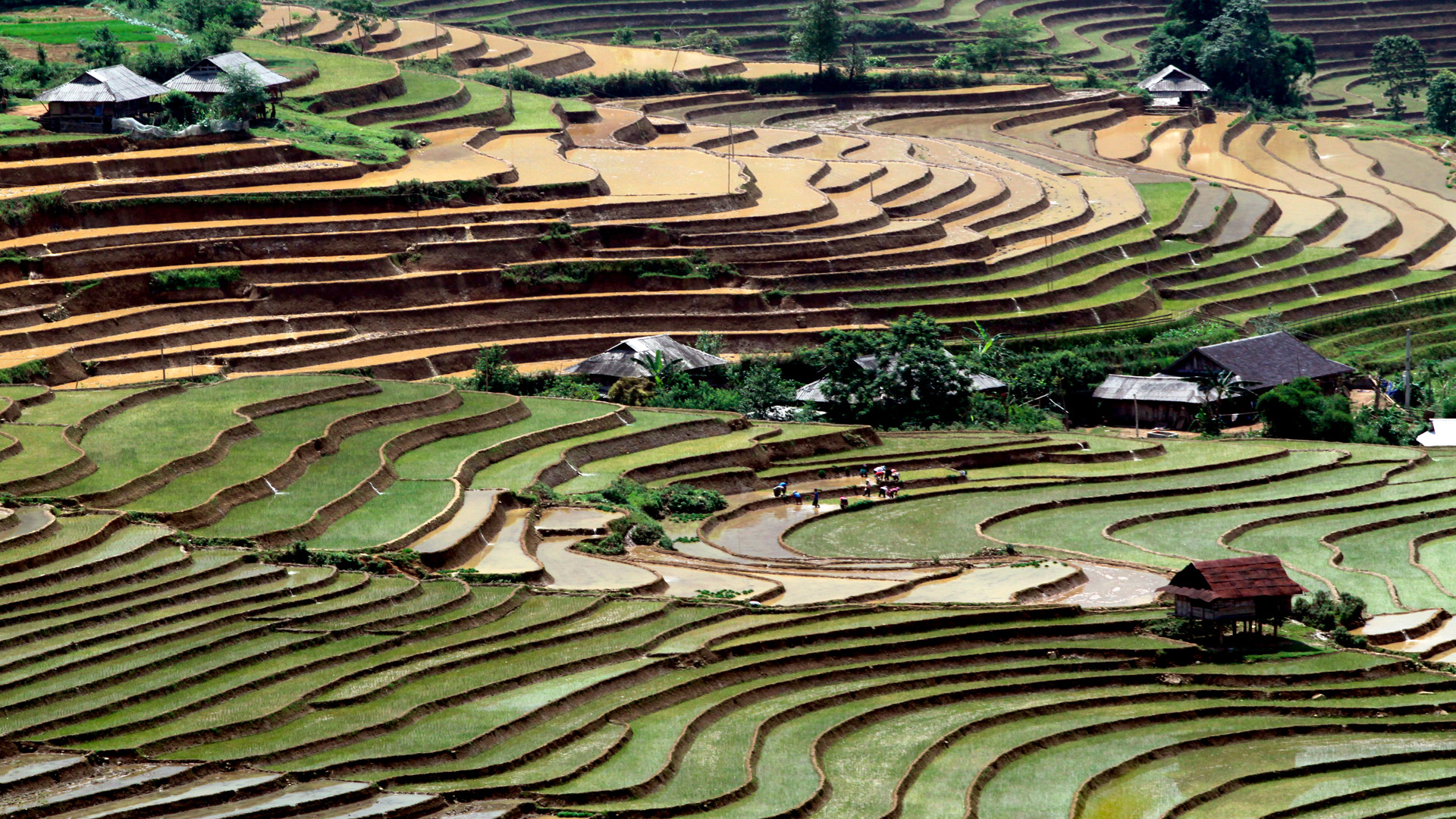 Ruộng bậc thang ở Lai Châu không chỉ đẹp vào mùa lúa chín, mà ngay cả vào mùa gieo cấy cũng đẹp như kỳ quan. Vào mùa này, những vạt ruộng bậc thang với những gam màu đa sắc đặc trưng của mùa nước đổ đẹp tựa một bức bích họa giữa non cao. Xen lẫn cánh đồng ruộng bậc thang là những ngôi nhà truyền thống của đồng bào, nơi lưu giữ nhiều nét văn hóa nông nghiệp riêng biệt của vùng cao Tây Bắc.