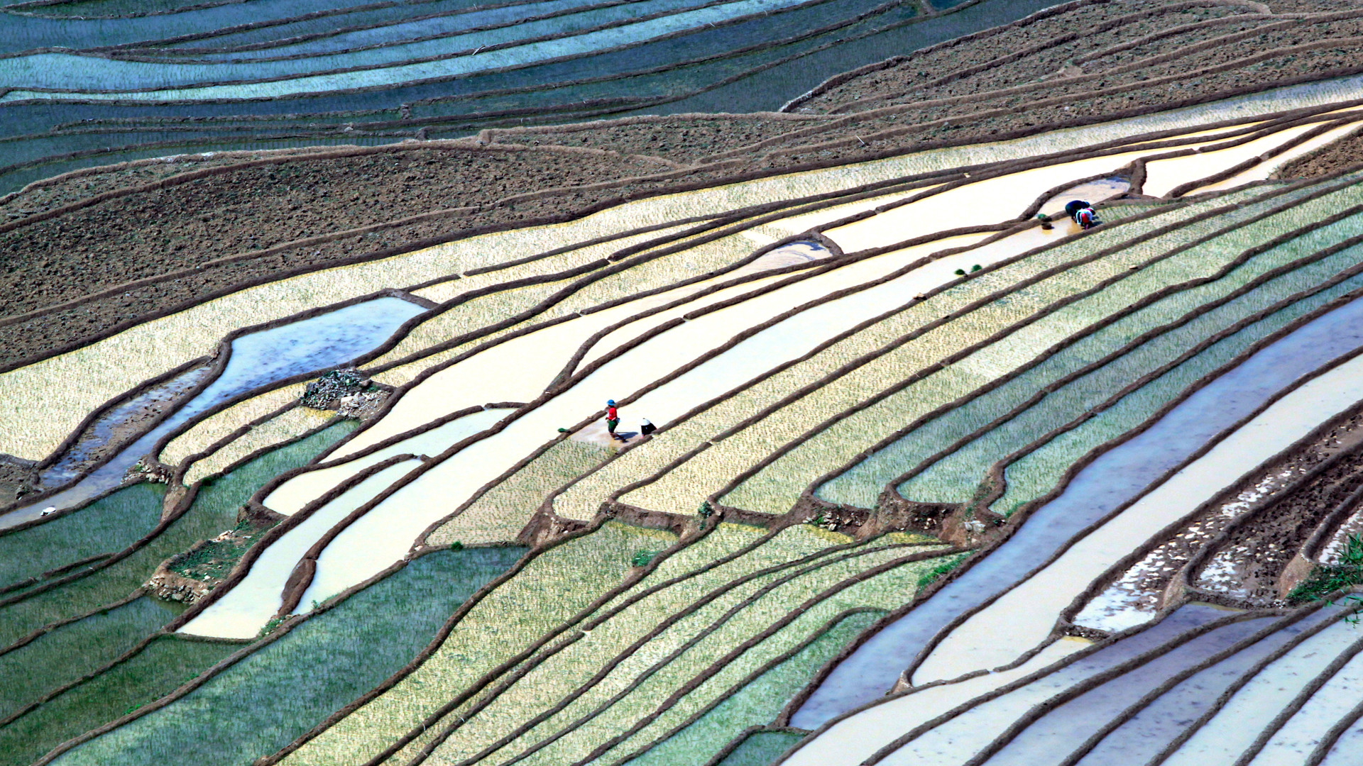 | Từ trên cao nhìn xuống, ruộng bậc thang như những bức tranh đa màu sắc của non cao khiến du khách, các nhiếp ảnh gia và các nhà làm phim say đắm. |
