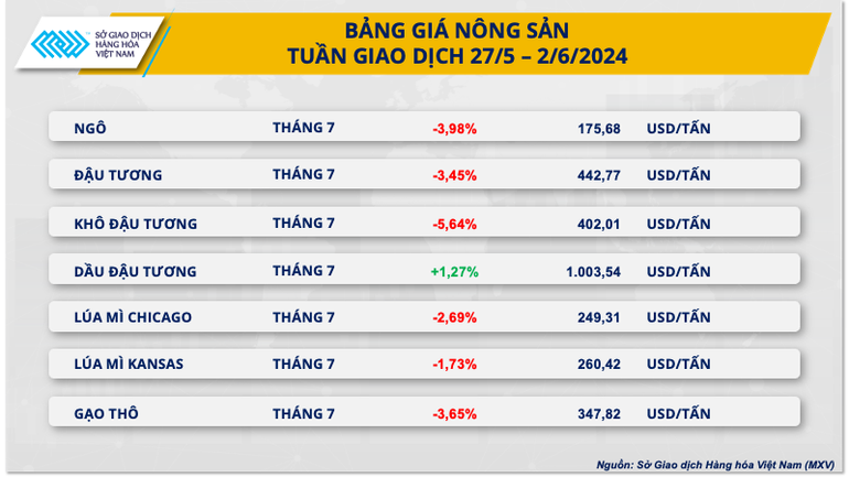 Kết thúc tuần giao dịch 27 - 31/5, các mặt hàng Việt Nam nhập khẩu nhiều để sử dụng làm nguyên liệu thức ăn chăn nuôi như ngô và khô đậu tương đều giảm mạnh, lần lượt giảm 4% và 5,6%. Giá ngô trên Sở Chicago đóng cửa tuần ở mức 175,88 USD/tấn và giá khô đậu tương đóng cửa đạt 402,01 USD/tấn, đều là mức thấp nhất kể từ đầu tháng 5. Các mặt hàng còn lại trong nhóm nông sản như đậu tương, lúa mì, gạo thô cũng đều giảm mạnh.