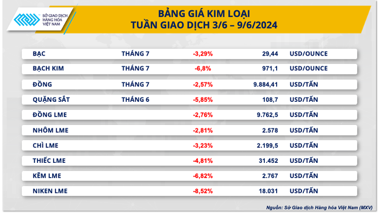 Theo Sở Giao dịch Hàng hóa Việt Nam (MXV), đóng cửa tuần giao dịch 3-7/6, lực bán hoàn toàn áp đảo trên thị trường hàng hóa nguyên liệu thế giới. Chỉ số MXV-Index giảm mạnh 1,56% xuống 2.279 điểm. Trong đó, nhiều mặt hàng ghi nhận các mức biến động rất mạnh, đặc biệt là các mặt hàng nhóm kim loại và nông sản.