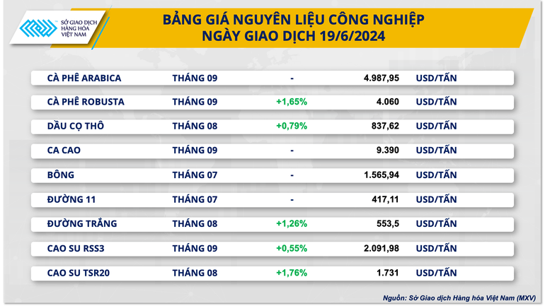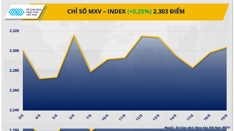 Thông tin từ Sở Giao dịch hàng hóa Việt Nam (MXV) cho biết, thị trường tương đối trầm lắng trong phiên giao dịch ngày 19/6, khi phần lớn các mặt hàng liên thông với Sở Giao dịch tại Mỹ đóng cửa nghỉ Lễ Juneteenth.