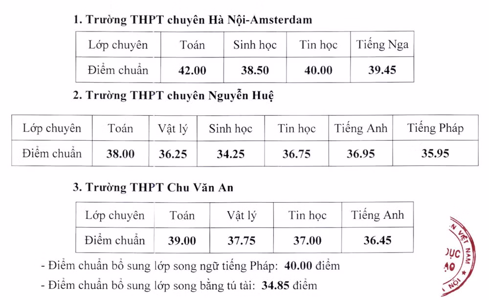 Chiều 12/7, Sở Giáo dục và Đào tạo Hà Nội công bố quyết định duyệt điểm chuẩn trúng tuyển bổ sung vào lớp 10 THPT chuyên, lớp 10 chương trình song ngữ tiếng Pháp, lớp 10 chương trình song bằng của Hà Nội năm học 2024-2025.