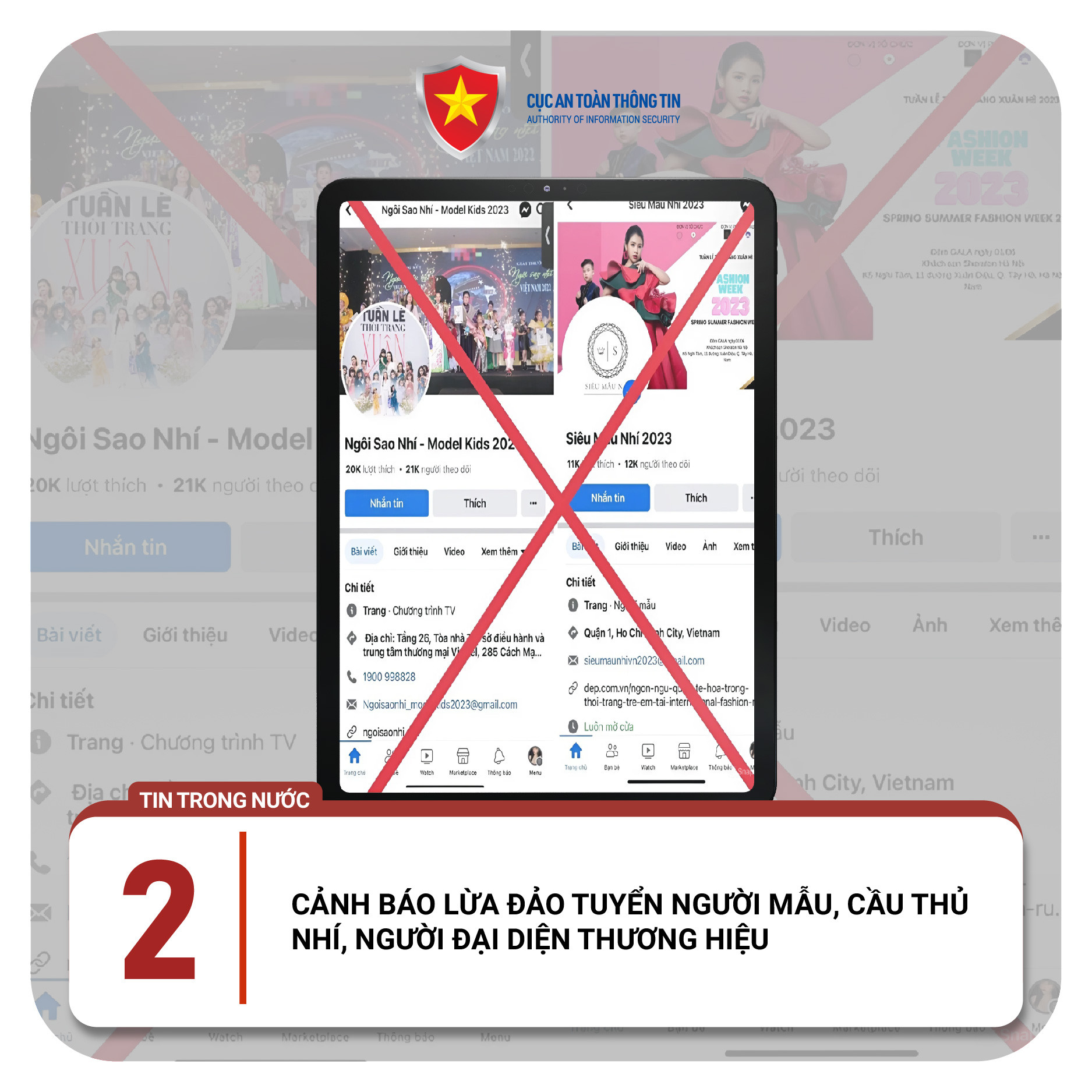 Lợi dụng các sự kiện lớn sắp diễn ra hoặc thời gian nghỉ lễ của trẻ nhỏ, các đối tượng tạo lập các trang mạng xã hội đăng thông tin tuyển người mẫu, ca sĩ, cầu thủ nhí hoặc tuyển đại diện cho các thương hiệu lớn để quảng bá sản phẩm.