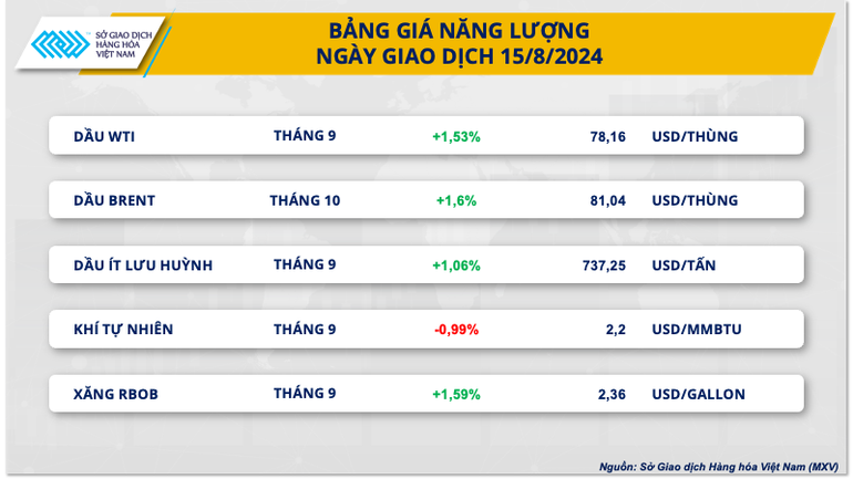 Giá dầu quay đầu tăng trong phiên giao dịch ngày hôm qua sau khi dữ liệu kinh tế Mỹ làm giảm bớt lo ngại về một cuộc suy thoái tại quốc gia này. Tuy nhiên, lo ngại về nhu cầu toàn cầu chậm hơn đã kiềm chế đà tăng của giá. Kết phiên, dầu thô WTI tăng 1,53% lên mức 78,16 USD/thùng, giá dầu Brent tăng 1,6% đạt mức 81,04 USD/thùng.