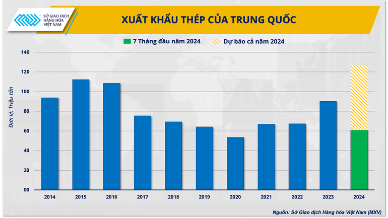 Trong những năm 2000, Trung Quốc đóng góp khoảng 15% trong tổng sản lượng thép toàn cầu. Đến năm 2023, con số này tăng lên hơn 54% và Trung Quốc trở thành nước xuất khẩu thép thành phẩm hàng đầu thế giới. Sang năm nay, theo ghi nhận của CISA, Trung Quốc đã xuất đi hơn 61 triệu tấn thép trong 7 tháng đầu năm và dự kiến tăng lên 127 triệu tấn trong cả năm nay, phá kỷ lục 110 tấn của năm 2015. Đáng lưu ý, năm 2015 cũng chính là năm gần nhất mà thị trường chứng kiến việc xuất khẩu thép của Trung Quốc tăng kỷ lục.