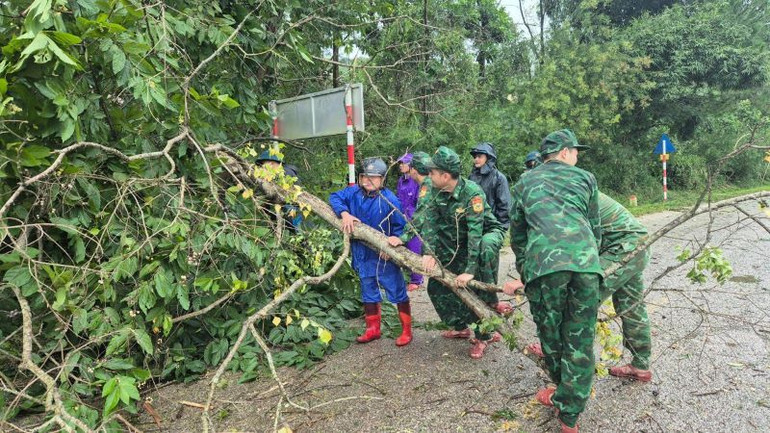 | Bộ đội Biên phòng thu dọn cây gãy đổ, tạo sự thông thoáng, thuận lợi cho nhân dân giao thông. |